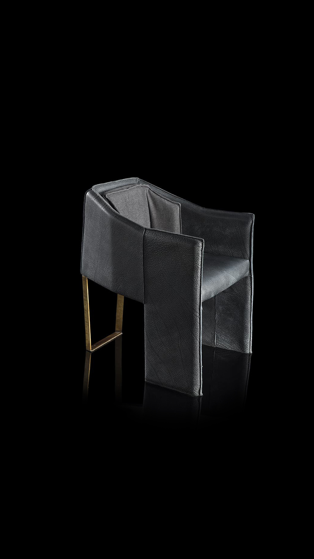Stol i massivträ, vadderad och klädd i läder,. Bakben i stål med finish i polerad mässing.