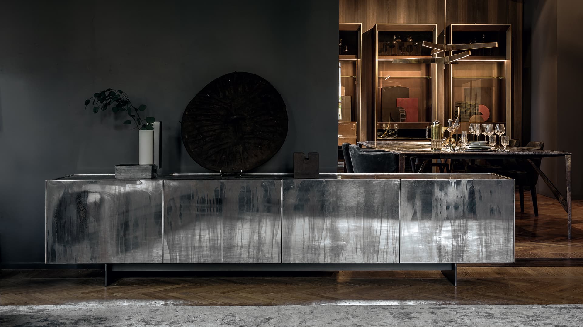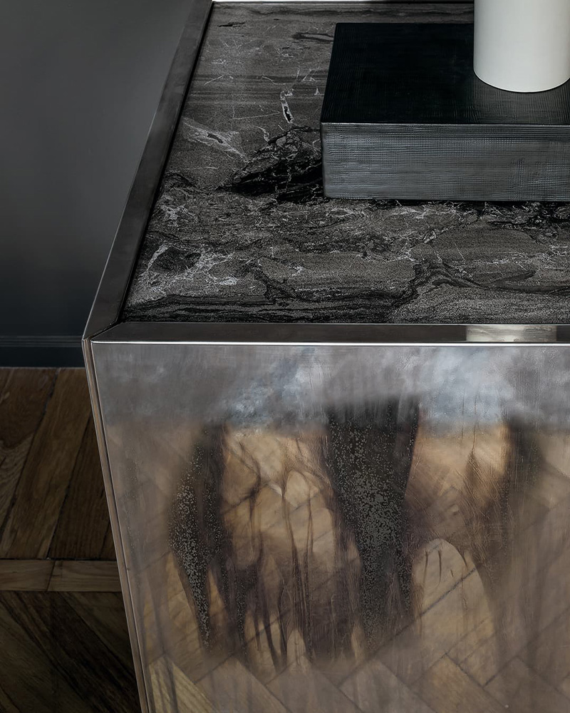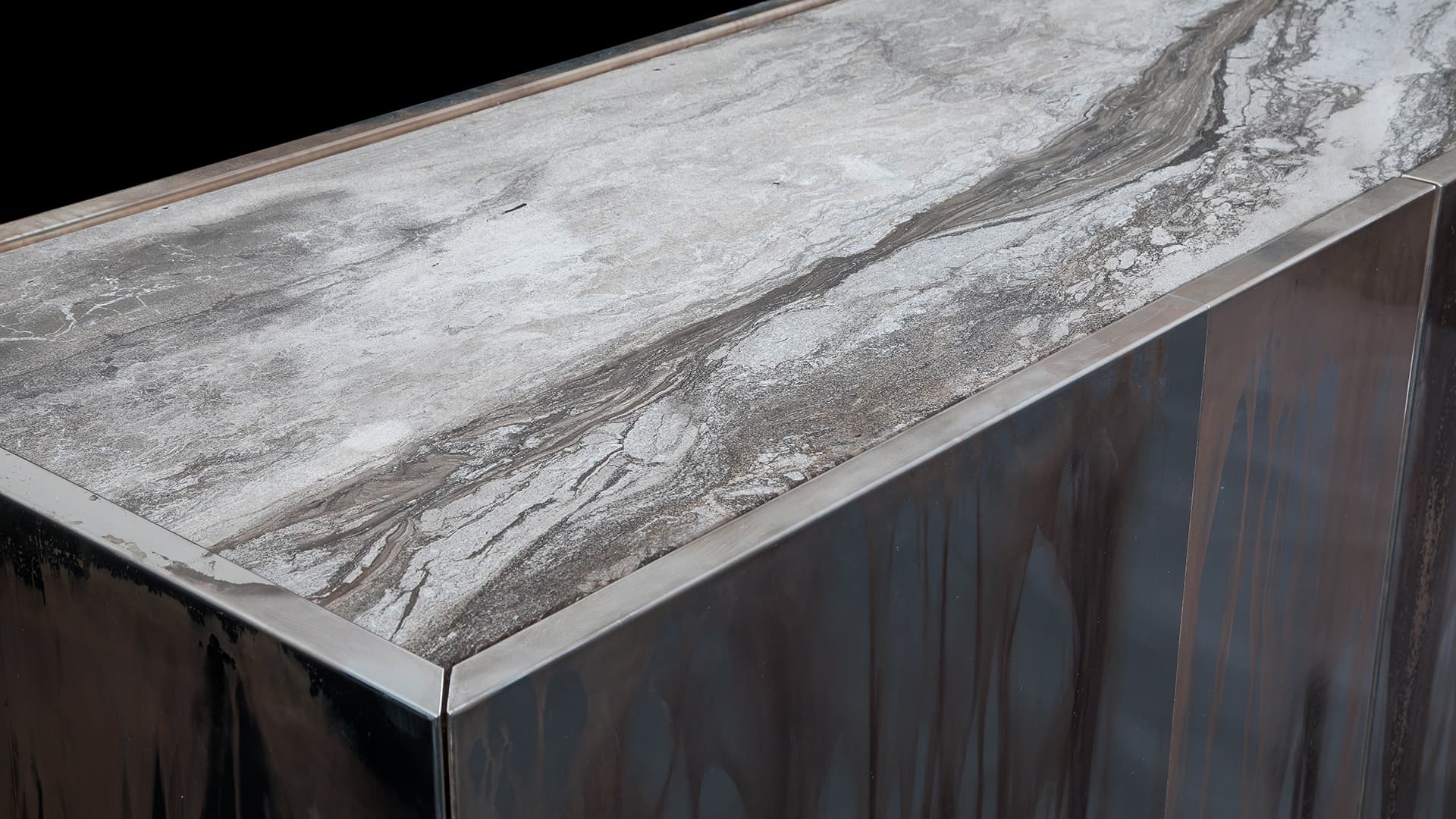 Struktur: Ram i massivt trä. Sidor 3,6 cm, topp och botten 5 cm och släta dörrar i 2,5 cm massivt trä, fanerade eller klädda i metall. Topp: Plywoodfanér eller täckt med stålmetallnät. Stentopp 2 cm, välj sten från vårt sortiment. Ytbehandling: Värmebehandlad träoljefinish baserad på naturligt vax och vatten - Ek thermowood, Eucalyptus thermowood, Black Eucalyptus thermowood, Swamp oak eller Swamp Elm. Metall gjorda enligt traditionella tekniker - Black Burnished Steel, Burnished Titanio, Burnished Platino, Burnished Brass, Black Burnished Brass, Brass Patina, H-Silver®, H-Silver® Black, H-Silver® Patina och H-Pale Gold® Patina.