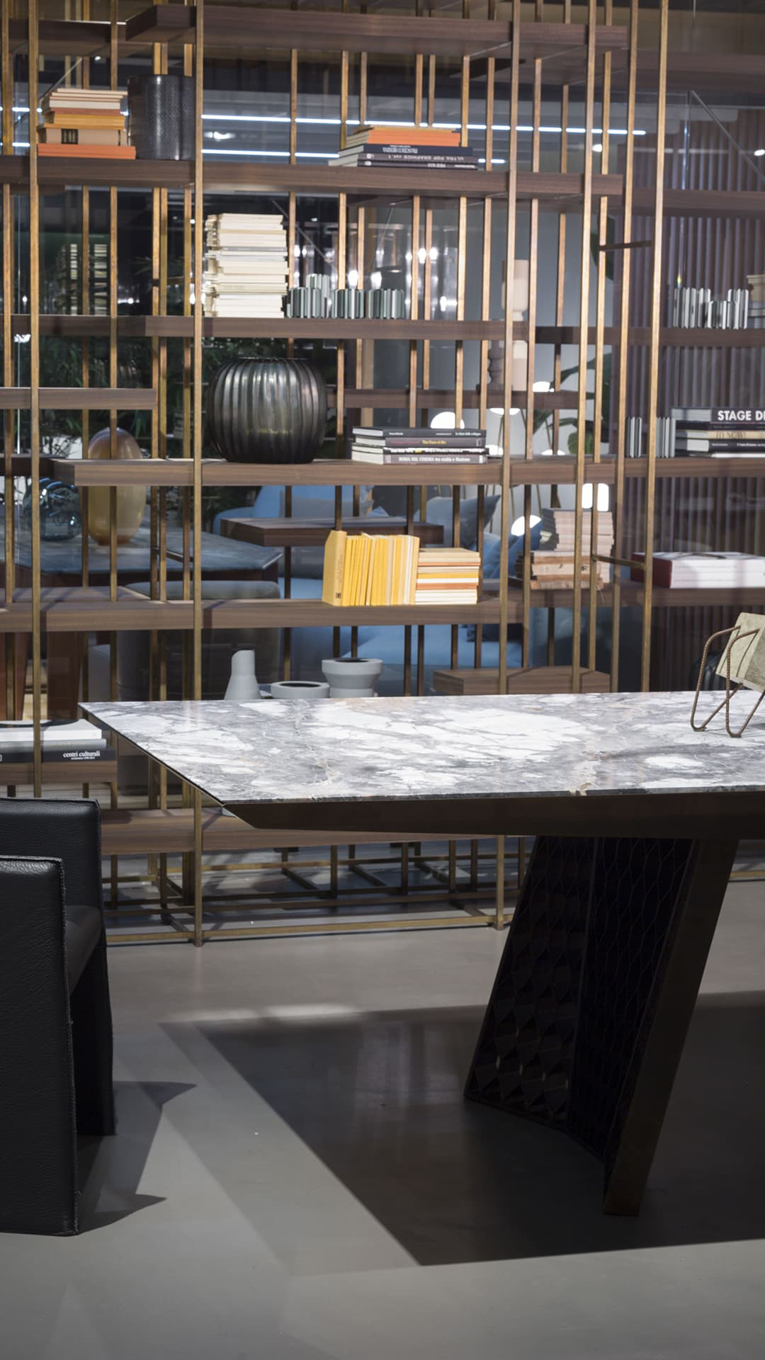 En retromodern design kännetecknar Stealth-bordets distinkta personlighet. Dynamiskt och elegant där den stora rektangulära sten- eller träskivan kombineras med lättheten hos metallbenen med ett mönster av honungskakor.
