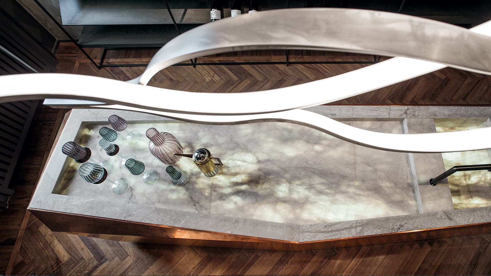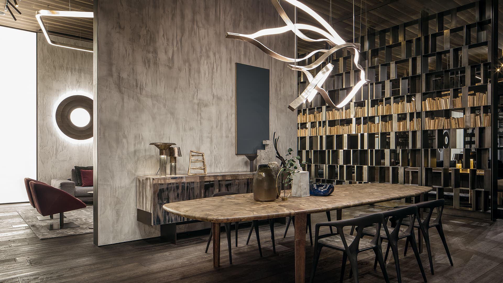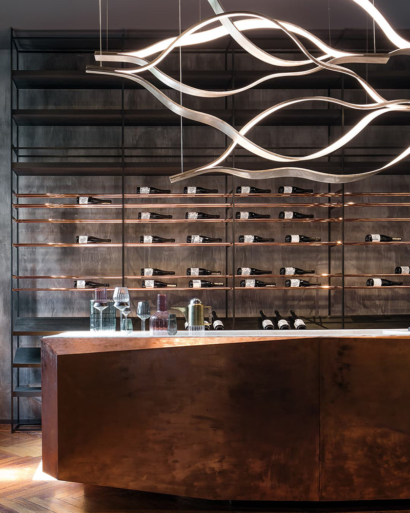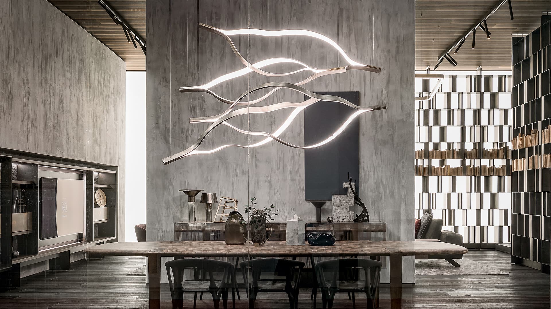• Pendellampor tillverkade av handböjda metallstänger i olika storlekar och konfigurationer.